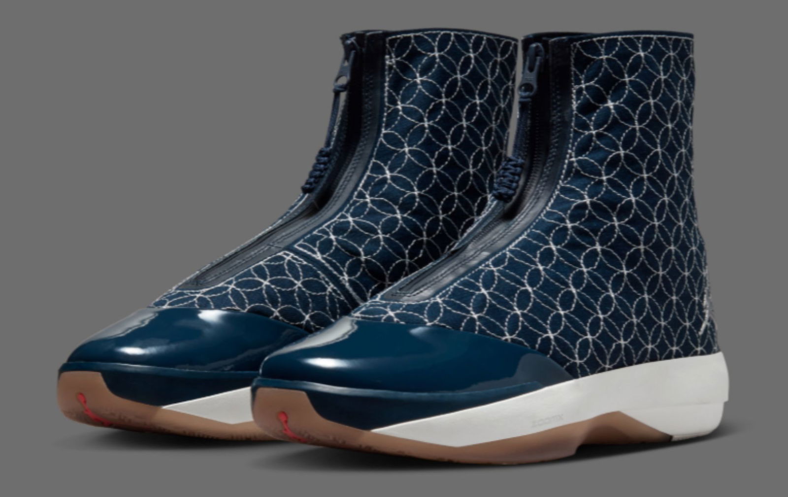 The official Air Jordan 40 "Rui Hachimura," also referred to as the Air Jordan 40-28 or 4028 PE by sneaker lovers. The sneaker carries the official style code IQ5893-400. The shoe is built on a clean College Navy, Sail, and Chrome colorway. Its upper side features sashiko-style stitching.