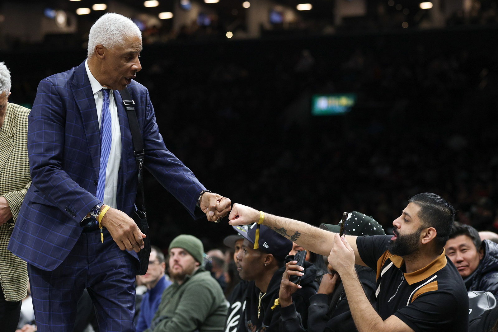 Feb 9, 2026; Brooklyn, New York, USA; Former NBA player Julius Erving k fists pumps a fan curtsied during the second half of the NBA game between the Brooklyn Nets and the Chicago Bulls at Barclays Center. Mandatory Credit: Vincent Carchietta-Imagn Images