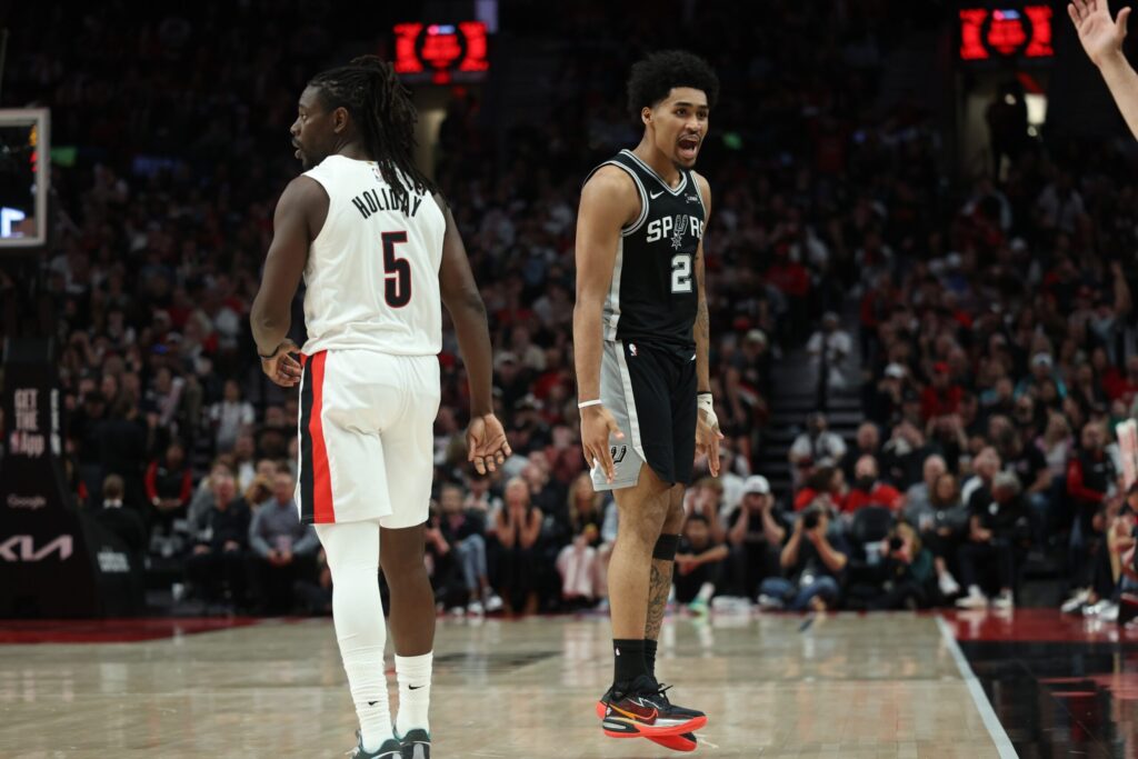 Apr 24, 2026; Portland, Oregon, USA; San Antonio Spurs guard Dylan Harper (2) reacts after scoring against Portland Trail Blazers guard Jrue Holiday (5) during the second half during game three of the first round of the 2026 NBA Playoffs at Moda Center. Mandatory Credit: Jaime Valdez-Imagn Images
